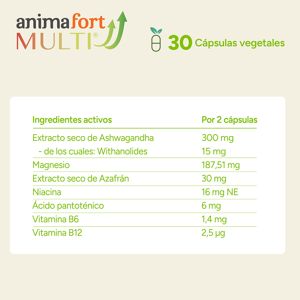 No, AnimaFort MULTI® no es un antidepresivo. Es un complemento alimenticio con ingredientes de origen 100% natural como Affron®, Ashwagandha, Magnesio y vitaminas del grupo B (B6, B12, Niacina y Ácido Pantoténico) que ayudan a favorecer el equilibrio emocional y el bienestar.